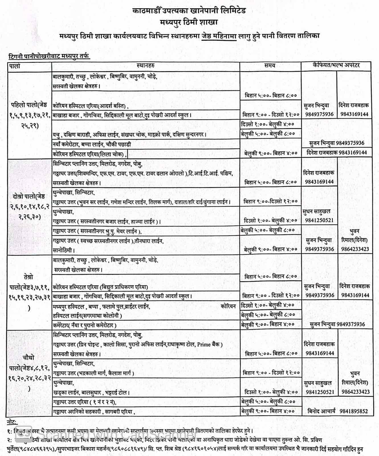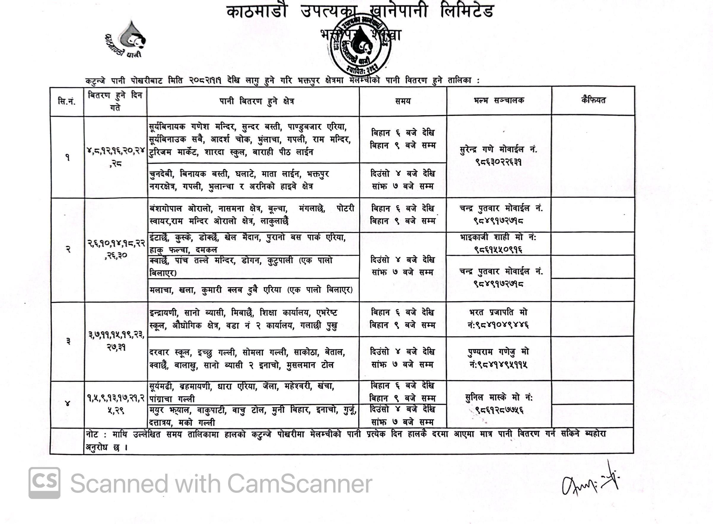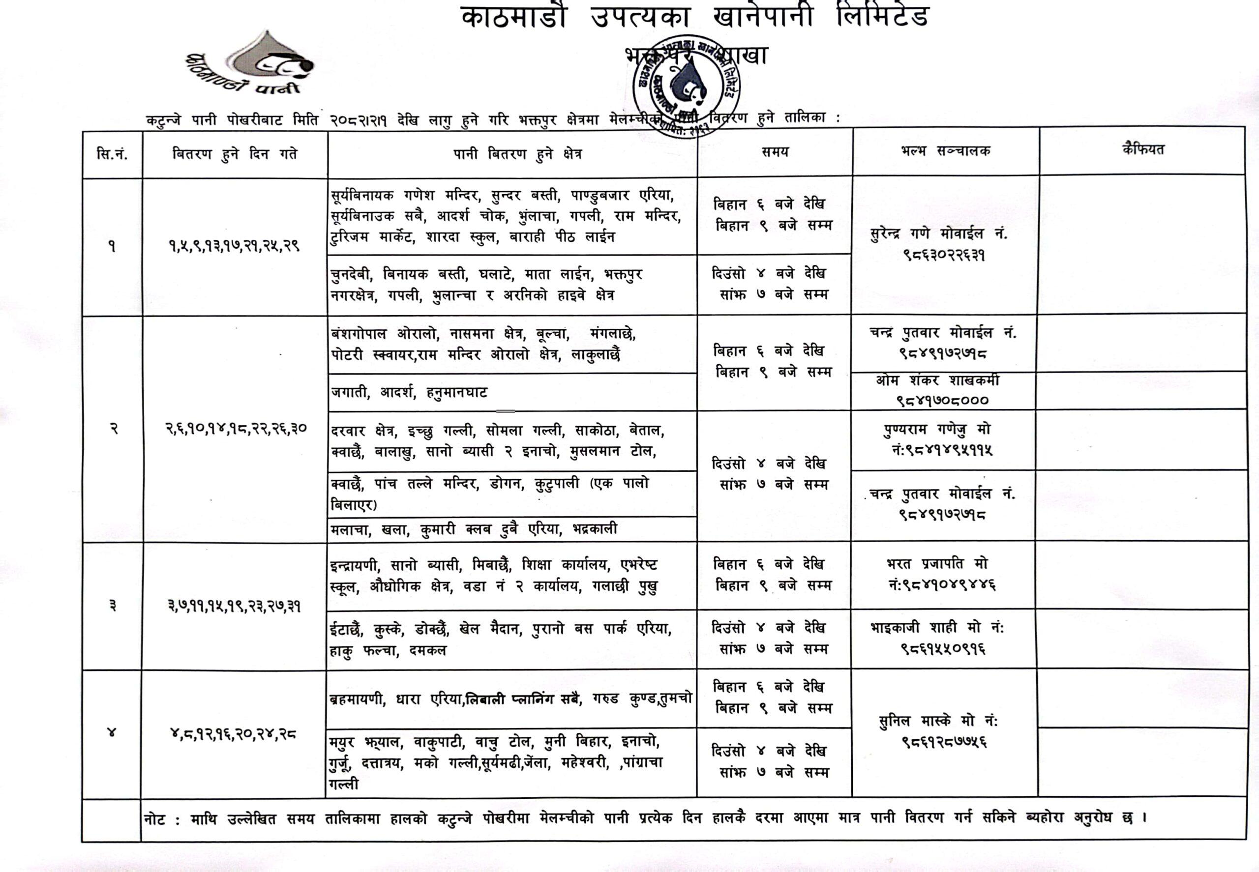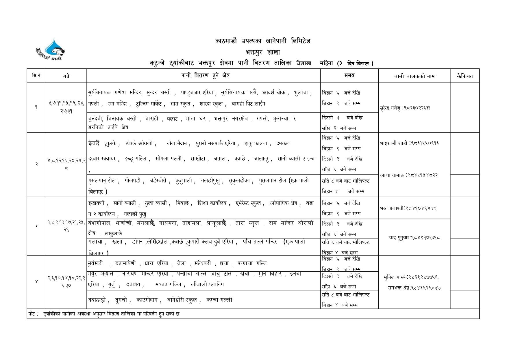 Water Distribution Schedule