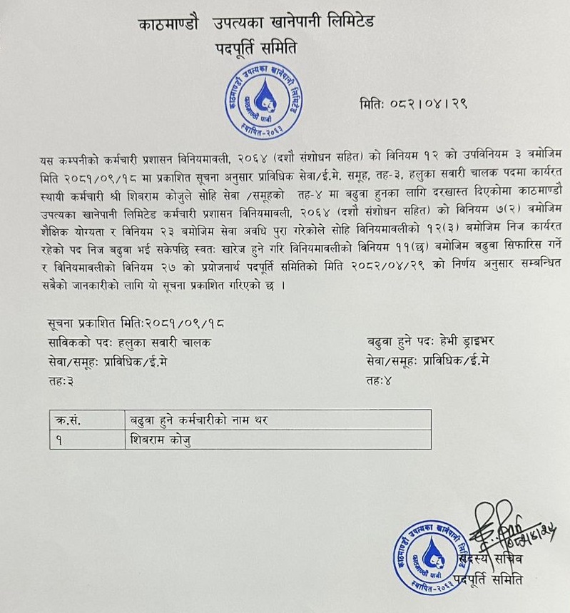 рдХрд╛рд░реНрдп рдХреНрд╖рдорддрд╛рдХреЛ рдЖрдзрд╛рд░рдорд╛ рдмрдвреБрд╡рд╛рдХреЛ рд▓рд╛рдЧрд┐ рдкреНрд░рдХрд╛рд╢рд┐рдд рд╕реВрдЪрдирд╛ тАУ рдкрджрдкреВрд░реНрддрд┐ рд╕рдорд┐рддрд┐ тАУ реирежреореи-режрей-реирен