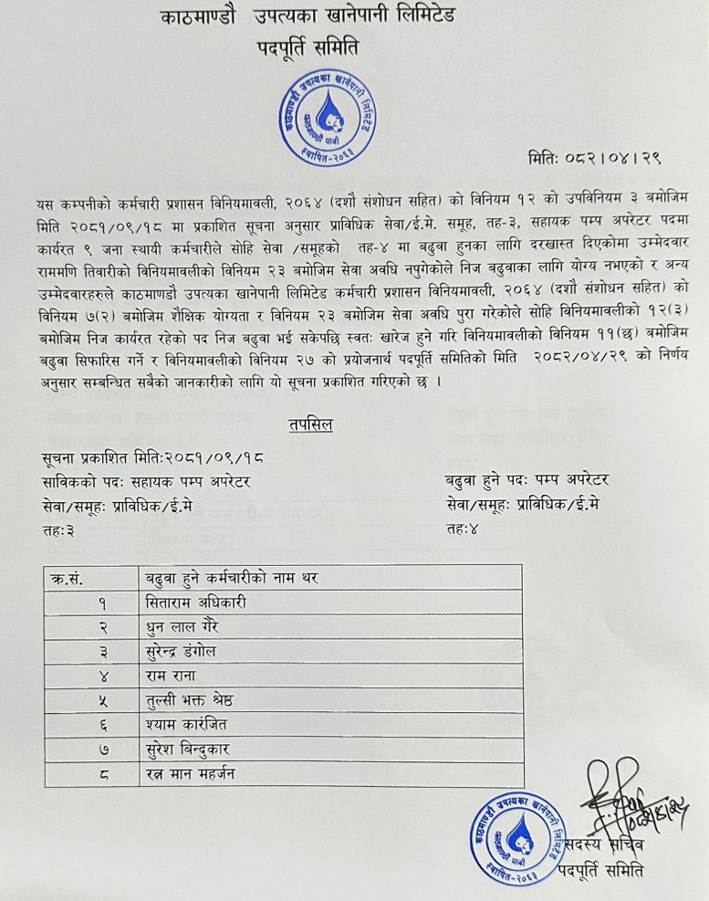 рдкрдореНрдк рдЕрдкрд░реЗрдЯрд░ рдкрджрдорд╛ рдмрдвреБрд╡рд╛ рд╕рдореНрдмрдиреНрдзрд┐ рд╕реВрдЪрдирд╛ тАУ рдкрджрдкреВрд░реНрддрд┐ рд╕рдорд┐рддрд┐ тАУ реирежреореи-режрек-реиреп