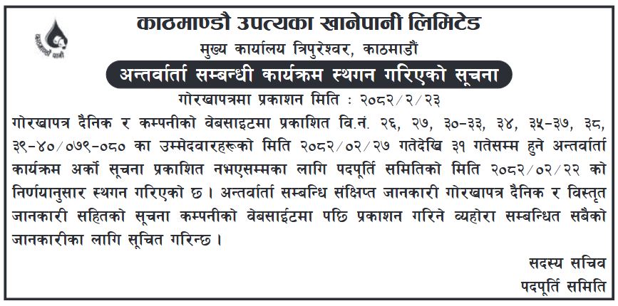 рдЕрдиреНрддрд░реНрд╡рд╛рд░реНрддрд╛ рд╕рдореНрдмрдиреНрдзрд┐ рдХрд╛рд░реНрдпрдХреНрд░рдо рд╕реНрдердЧрди рдЧрд░рд┐рдПрдХреЛ рд╕реВрдЪрдирд╛ (рдЧреЛрд░рдЦрд╛рдкрддреНрд░рдорд╛ рдкреНрд░рдХрд╛рд╢рд┐рдд) тАУ рдкрджрдкреБрд░реНрддрд┐ рд╕рдорд┐рддрд┐ тАУ реирежреореи-режреи-реирей